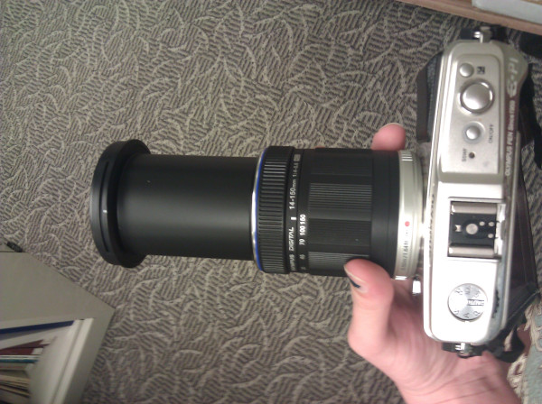 After some harrowing FedEx issues, my new splurge lens arrived. My Olympus EP1 is a micro four-thirds lens, so the lenses actually are quite different from a DSLR, for example, my 17mm pancake lens is actually the equivalent of a DSLR 34mm. This new lens goes from 14-150mm, which is like 28-300mm on a regular DSLR, making it effectively a zoom & a telephoto, which, in English, means that a shot from my porch that looks like this with the 17mm: